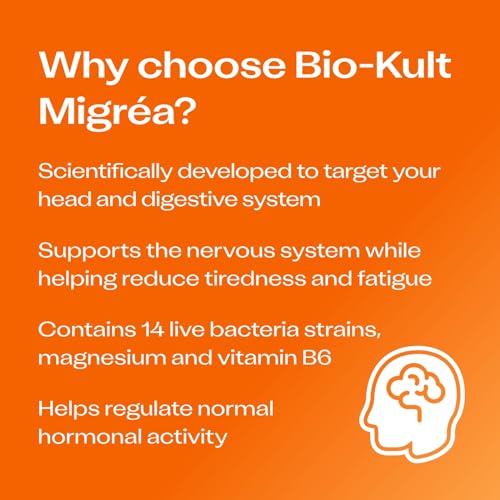Size:1 Pack Product Description Bio-Kult Migréa is an advanced multi-action formulation designed to target both the digestive tract and the head. Bio-Kult Migréa has a unique 14 strains combination of live bacteria alongside magnesium and vitamin B6, both of which contribute to the normal functioning of the central nervous system. Magnesium and vitamin B6 contribute to the reduction of tiredness as well as contributing to normal psychological function. Vitamin B6 has been shown in studies to help protect against inflammation and also has the added benefit of contributing to the regulation of hormonal activity and homocysteine metabolism. The strains of live bacteria in Bio-Kult Migréa have been proven to survive the high-acidity of stomach acid and complement the existing gut flora naturally present in a healthy person’s digestive system. Bio-Kult Migréa is gluten-free and contains no artificial colours or flavourings. How can I take Bio-Kult Migréa? You can swallow them with water (taking 1-2 per day with food), or if you prefer not to swallow capsules, you can empty the contents into juice, food or sprinkle directly onto your tongue! Ingredients and Directions for Use Ingredients: Magnesium citrate Vitamin B6 (Pyridoxine Hydrochloride) Live bacteria (see strains below) Vegetable capsule (hydroxypropyl methylcellulose) Milk and soya – used in the fermentation process. Content of milk is at a level that would not affect lactose intolerance sufferers) Live Bacteria: Bacillus subtilis PXN 21, Bifidobacterium bifidum PXN 23, Bifidobacterium breve PXN 25, Bifidobacterium infantis PXN 27, Bifidobacterium longum PXN 30, Lactobacillus acidophilus PXN 35, Lactobacillus delbrueckii ssp. bulgaricus PXN 39, Lactobacillus casei PXN 37, Lactobacillus plantarum PXN 47, Lactobacillus rhamnosus PXN 54, Lactobacillus helveticus PXN 45, Lactobacillus salivarius PXN 57, Lactococcus lactis ssp. lactis PXN 63, Streptococcus thermophilus PXN 66 Nutrition information (per 2 capsules) Magnesium 90mg (24% NRV) Vitamin B6 4mg 571% NRV) 2 billion microorganisms (2 x 109 CFU/capsule) equivalent to 4.3 billion microorganisms per gram (4.3 x 109 CFU/g) NRV = Nutrient Reference Value Storage: Store in a cool dry place – out of direct sunlight. No refrigeration required. Total bacteria count viable until the end of shelf life Directions for use*: Take 1-2 capsules per day with food. Children: Parents should seek guidance from a medical practitioner before giving Bio-Kult Migréa to children. Pregnancy: Bio-Kult Migréa is suitable for use during pregnancy, but we would always suggest consulting your doctor or healthcare practitioner before taking any food supplement. Do not exceed recommended daily intake. Excess / high doses of magnesium may cause mild stomach upset in some sensitive individuals. Long term intakes (>10mg/day) of vitamin B6 may lead to mild tingling and numbness. *If you are taking any medications or have any medical conditions, please consult your doctor before taking any nutritional food supplements. Ingredients Ingredients: Magnesium citrate Vitamin B6 (Pyridoxine Hydrochloride) Live bacteria (see strains below) Vegetable capsule (hydroxypropyl methylcellulose) Milk and soya – used in the fermentation process. Content of milk is at a level that would not affect lactose intolerance sufferers) Live Bacteria: Bacillus subtilis PXN 21 Bifidobacterium bifidum PXN 23 Bifidobacterium breve PXN 25 Bifidobacterium infantis PXN 27 Bifidobacterium longum PXN 30 Lactobacillus acidophilus PXN 35 Lactobacillus delbrueckii ssp. bulgaricus PXN 39 Lactobacillus casei PXN 37 Lactobacillus plantarum PXN 47 Lactobacillus rhamnosus PXN 54 Lactobacillus helveticus PXN 45 Lactobacillus salivarius PXN 57 Lactococcus lactis ssp. lactis PXN 63 Streptococcus thermophilus PXN 66 Nutrition information (per 2 capsules) Magnesium 90mg (24% NRV) Vitamin B6 4mg 571% NRV) 2 billion microorganisms (2 x 109 CFU/capsule) equivalent to 4.3 bill