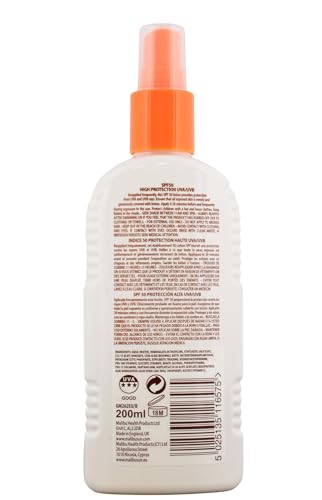 Directions: Spray as needed onto skin. Ensure that all skin is evenly and generously covered. Water and sweat resistant but reapply after towelling and swimming. This product provides a high factor 50 sun protection. Suitable for children. Cautions: for external use only. Do not apply to broken skin. Keep out of the reach of children. Avoid contact with fabrics and eyes. If contact with eyes occurs, rinse with clean water. If irritation persists, seek medical attention. Malibu recommends SPF 30 and above for children. Protect children with a hat and loose clothes. Keep babies in shade. Seek shade between 11am and 3pm. “Every one’s skin is different and the sun varies in intensity – take care in the sun to avoid over exposure.”
