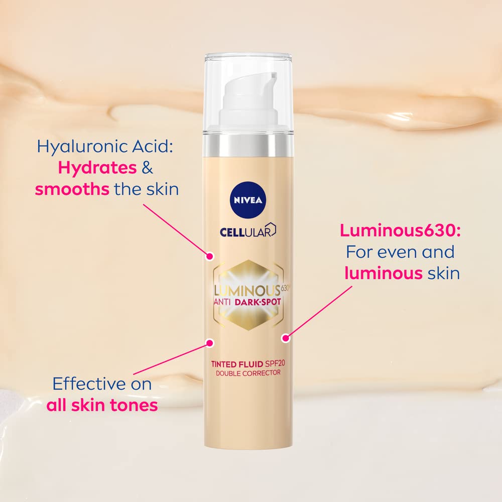 NIVEA Cellular LUMINOUS 630 Anti-Dark Spot Tinted Fluid SPF 20 Double Corrector – Goodbye Dark Spots. Hello Luminous Skin!
